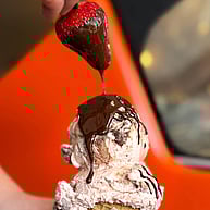 Sweet strawberry gelato wrapped in ripples of house-made choc fudge. Just like chocolate dunked strawberries getting you in the mood for a spoon ;)