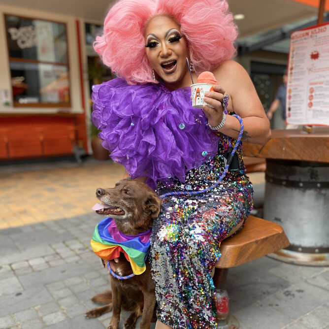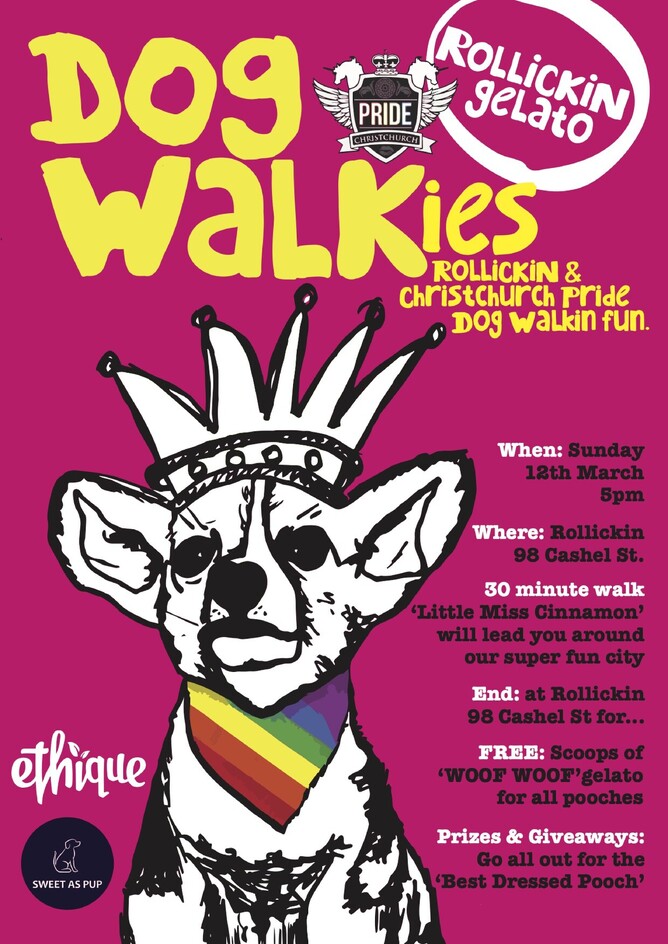 Rollickin Gelato along with Christchurch Pride (& our great friends at Ethique & Sweet as Pup & Furtography) are dog walking with the fabulous 'Little Miss Cinnamon' leading the way.