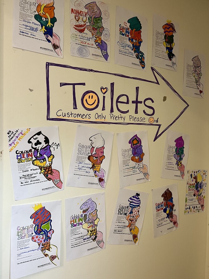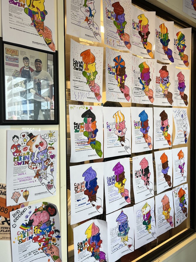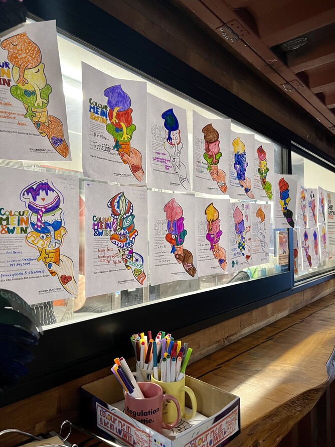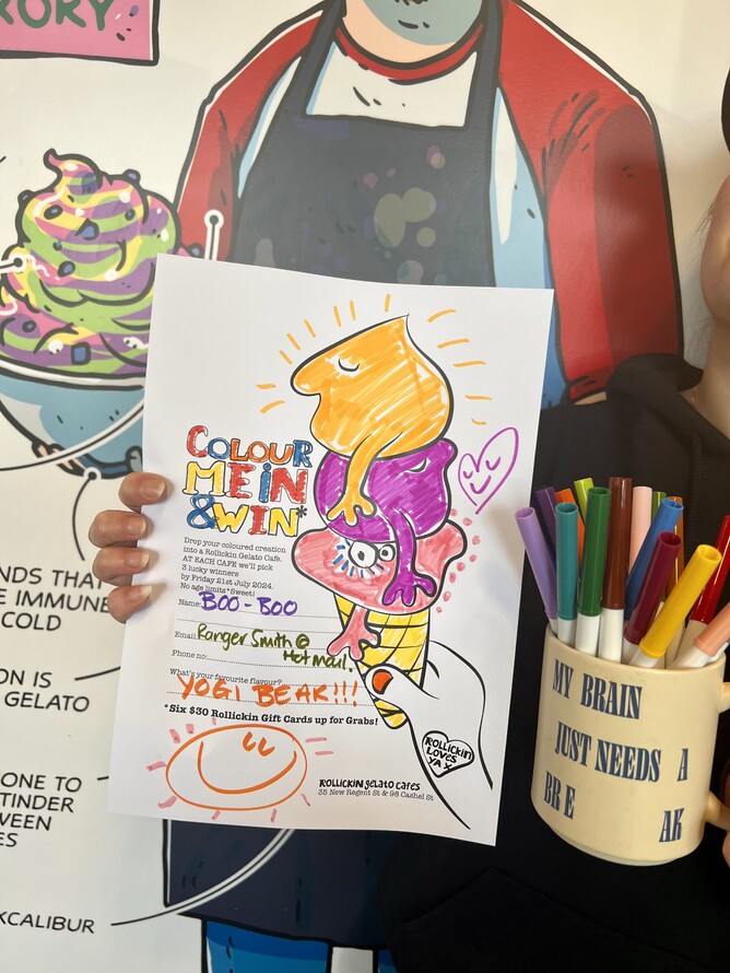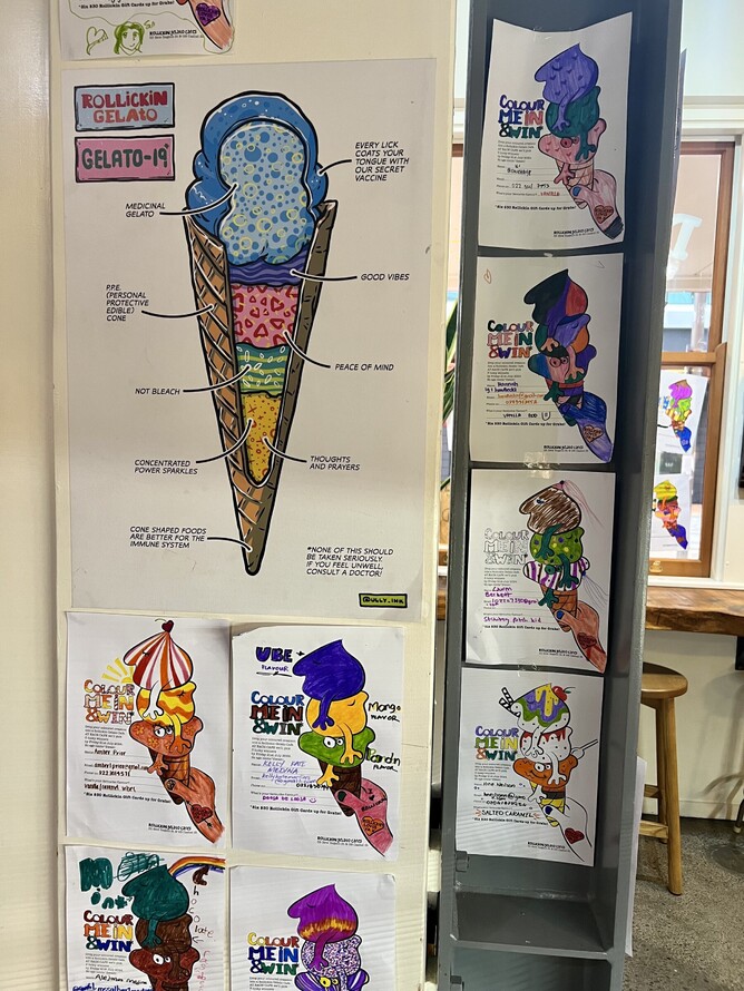Things have gotta little art crazy with our Rollickin no age limit colouring gelato competition. Everyones concentrating, licking gelato and colouring in. A great way to pass away those wintry blasts we are having over the School Holidays here in Christchurch. Waiting for snow!!! Our walls have been plastered with many many many works of gelato art! Love it! And it's not over yet! Still got a week of colouring to go. Six prizes up for grabs - Rollickin Gelato $30 Gift Cards! Gimme a competition and the felt pens...my turn to enter!