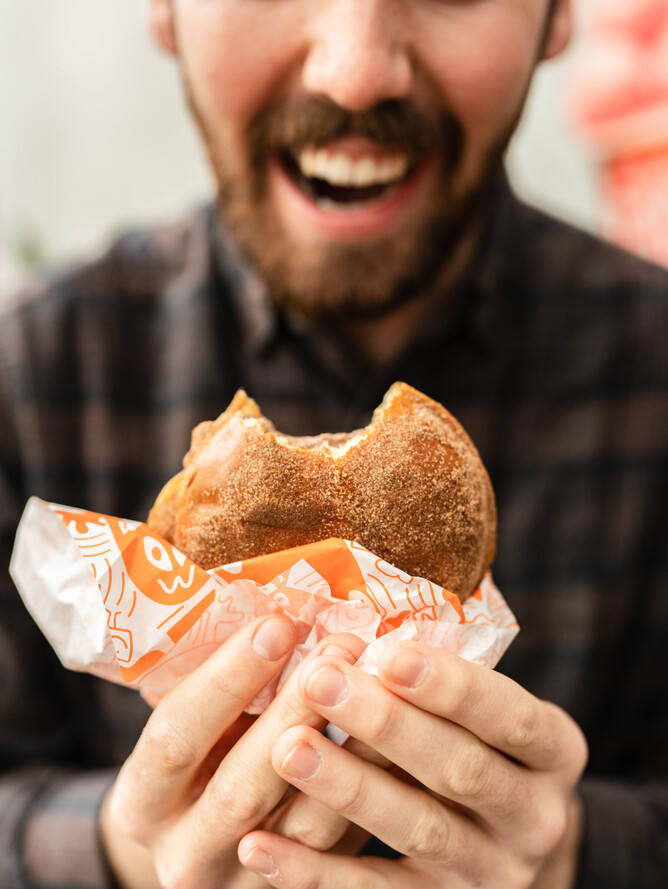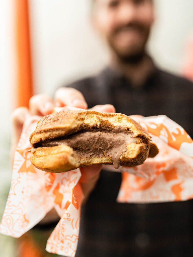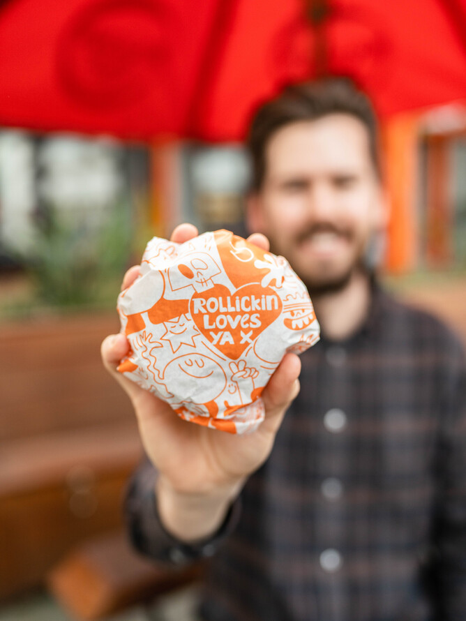 Pick your favourite Rollickin scoop and sauciness (Berry, Choc Fudge or Caramel) and we’ll magically toast inside a brioche donut bun.