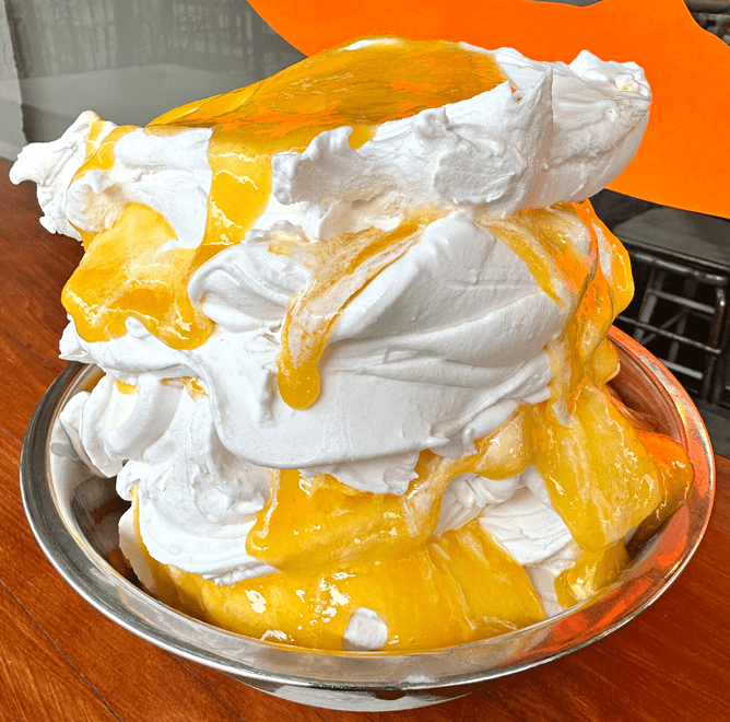 They are whipping dreamy really creamy salted COCONUT sorbet and then adding swirls of MANGO salsa.