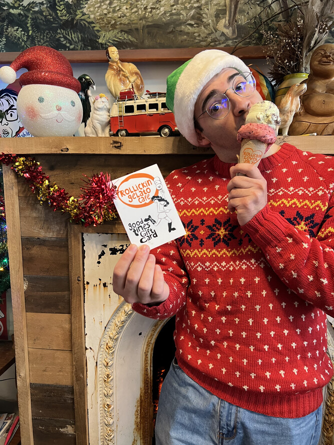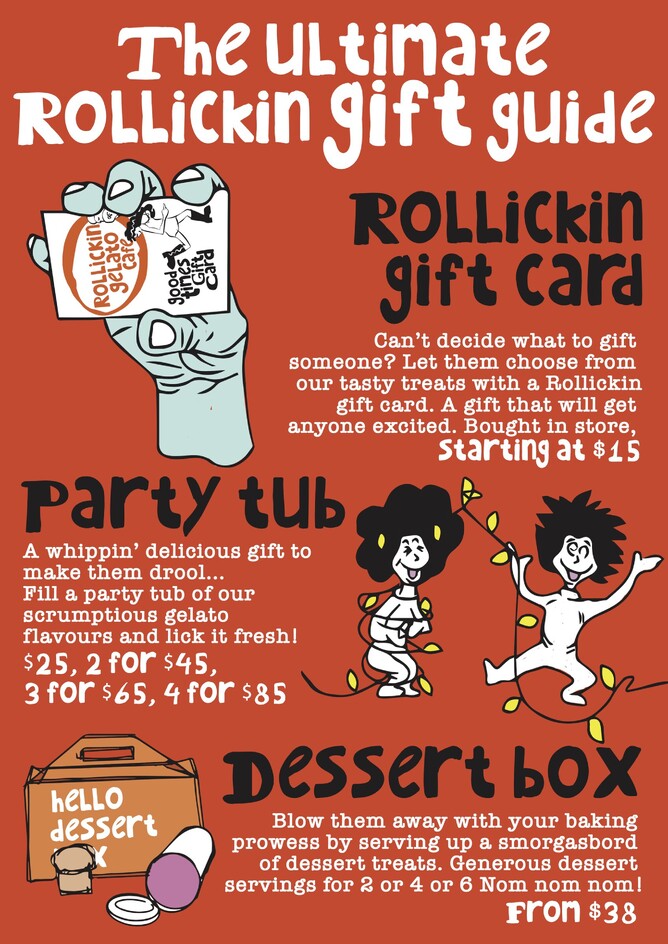 Grab them in Rollickin Gelato Cafes (if you live in the best city - Christchurch!). Our team are happy to load a Rollickin Gift card with money - starting from $15.