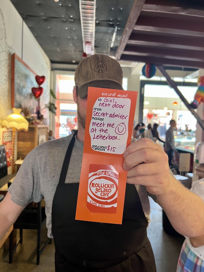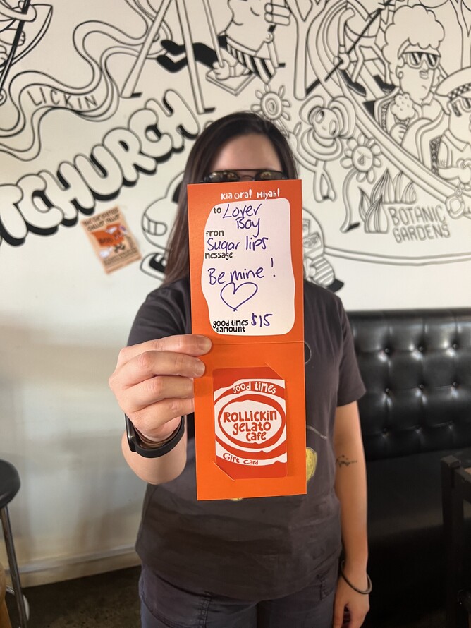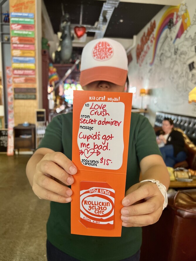 You've got this! Grab a Rollickin Gelato Gift Card from a Rollickin Gelato Cafe from $15 or online (from $25). If you are buying online, yes, we can add your loved up message & post for you.