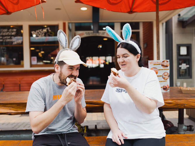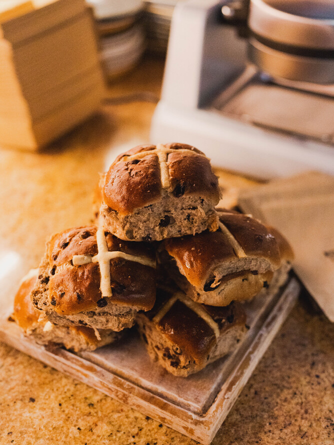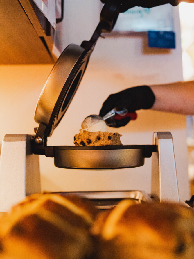 Rollickin Gelato cafes are smelling like Easter! The crew are deliciously toasting Hot Cross Buns with your pick of gelato inside. Check out our super special gelato toasting machine. OMG! It's Easter dessert heaven. You can pick from a delicious CHOCOLATE Hot Cross bun or the old classic FRUITY SPICE. I love the VEGAN Fruity Spice teamed with a scoop of Hokey Pokey gelato. Oh Yes, we've got you covered Vegans for Easter Hot Cross bunning.