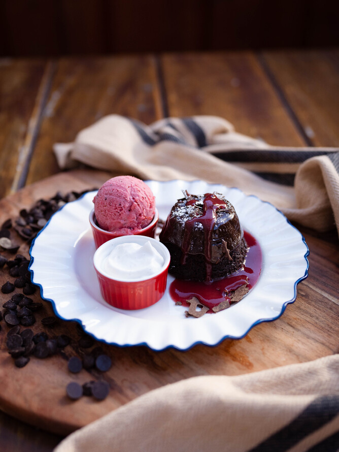 Hot CHOCOLATE CAKE dripping in chocolate ganache. Add melting chocolate flakes and drippin berry sauciness and chocolate crumbs and dollops of coconut yogurt and yes, your favourite Rollickin Gelato meltin scoop. I’m Vegan, Gluten Free, Dairy Free, Egg Free.