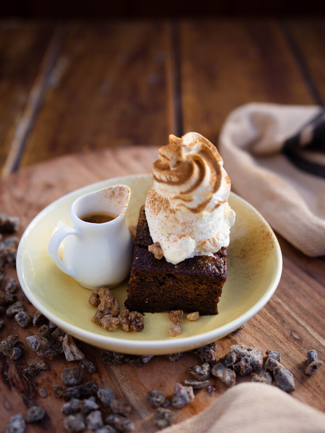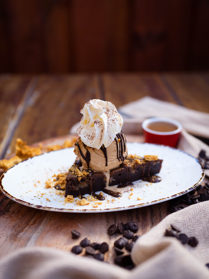 HOT Sticky Date Pudding that’s moreishly datey and moisty! Swimming in hot house-made BUTTERSCOTCH sauceyness and stacked with Vanilla creamo, cinnamon love dustin, candied walnuts and your favourite Rollickin icecream scoop. Go on dive right in!