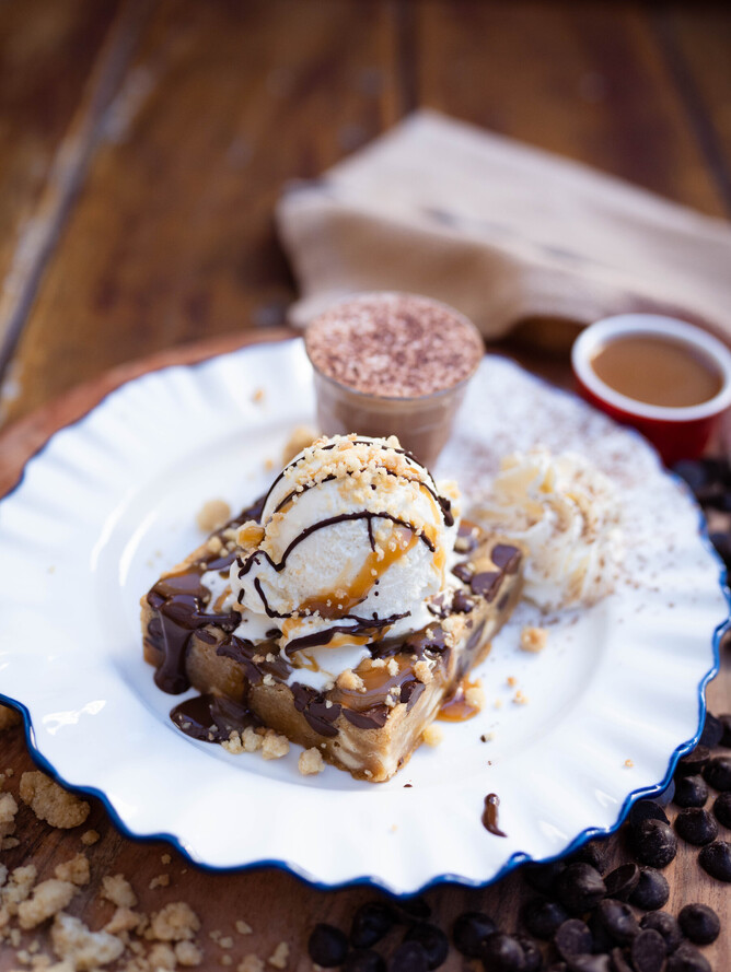 Hot COOKIE filled with white and dark chocolate! Add a chocolate and caramel drizzling and bikkie crumbles and your favourite meltin Rollickin scoop and vanilla cream and chocolate dust &anda wee warmed chocolate glass of milk for your cookie dipping.