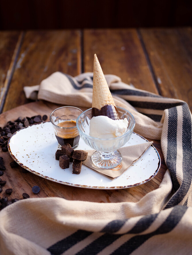 Get more pep in your step! Tip a double shot of C4 organic espresso over your favourite Rollickin gelato scoop in a choc dipped waffley cone and yes! I spy brownie nibbles.
