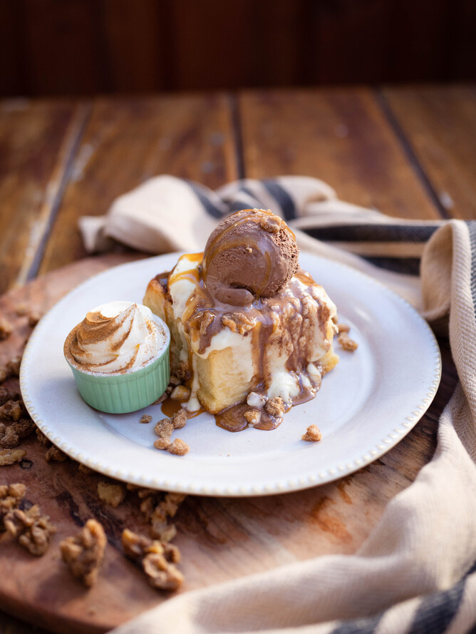 A warm snuggly sweet house-made brioche CINNIE BUN, caramelised brown sugar and cinnamon filling - melting cream cheese icing topped with your favourite Rollickin icecream scoop and gooey caramel sauciness and candied walnuts and vanilla cream and a cinnamon love dusting. Best comfort food ever!
