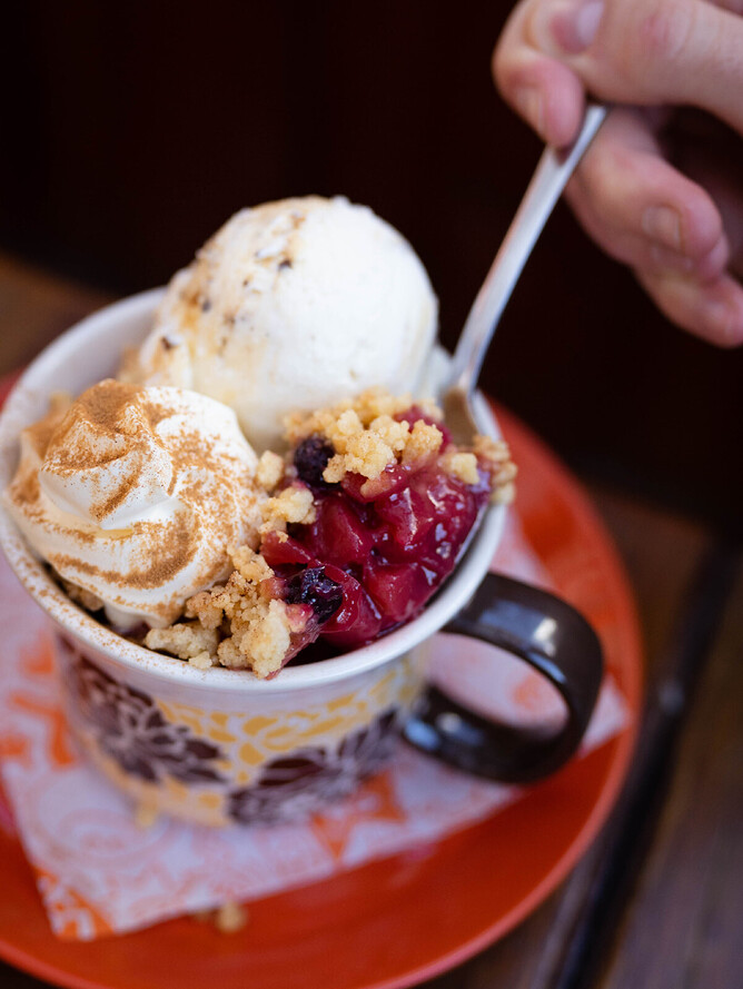 Our Bakers have been working on a new Rollickin Hot Dessert that uses all the seasonal fruit that turns-up in our kitchens. And viola the HUMBLE CRUMBLE! It's presently chokka filled with Apples and Berries. OMG! It's sooo good.