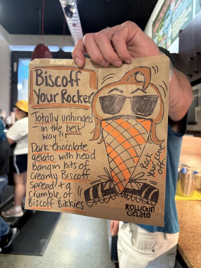 This bad boy has dark chocolate gelato, head banging hits of creamy Biscoff spread, & a crunchy crumble of Biscoff biscuits. Yep, this will rock your cone off.