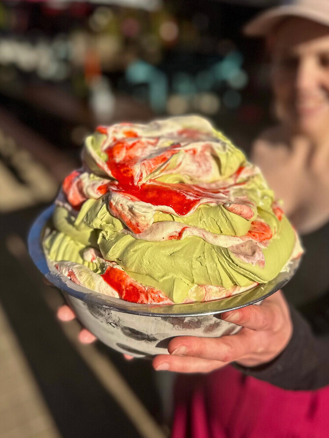 Whippin’ lush Kyoto matcha - layered with clouds of strawberry & vanilla cream ripple.
