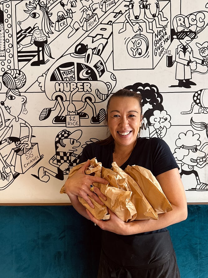 Family-owned, Mary (the mum) is behind the food, cooking it all up day after day, and Gum (pictured here) is part of the heartbeat of the place, running front of house and keeping it all moving. Those bags she’s holding? That’s them dropping off a massive feed for our staff at the end of the day. Even now, they’re still looking after the people around them 🧡