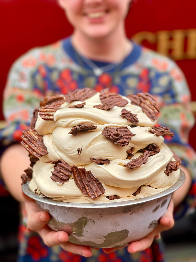 Salted caramel gelato loaded with dark choc coated Heartland Southern Sea Salt chips. Sweet, salty, & crunchy… it’s giving first-class chaos.