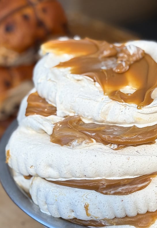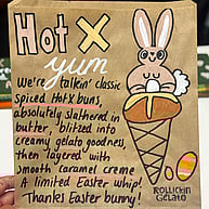 We’re talkin’ classic spiced hot cross buns, absolutely slathered in melty butter, blitzed into creamy gelato goodness, then layered with smooth caramel creme.