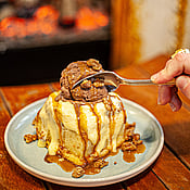 Stay at home & snuggle with a big hot Cinnie Brioche Bun, all meltin & warm & nummy. Topped with cream cheese icing & then your favourite meltin scoop. Add drizzlin gooey caramel sauciness & sprinkles of candied walnuts. X Nom! Nom!